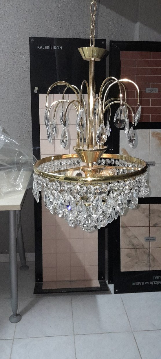 Altın renkli sarkıt avize, kristal damlacıklarla süslenmiş dairesel çerçeve ve kavisli kollara sahiptir. pirinç malzeme kullanilmiş anne annemizden kalan 100 yasında bu avize temiz kullanildi 30 cm