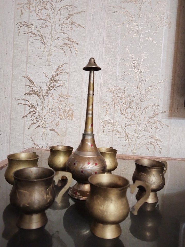 Oyma detaylı, uzun boyunlu koyu camel renkli bakır vazo ve kulplu altı bardak seti. 6 parça