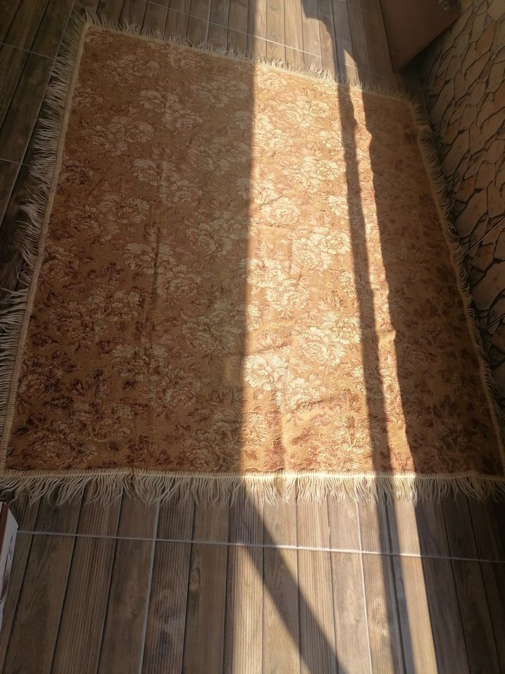 Antika Bej renkte, parlak yüzeye sahip bohem tarzı halı, püsküllü kenarlarıyla sıcak ve davetkar bir atmosfer sağlar.