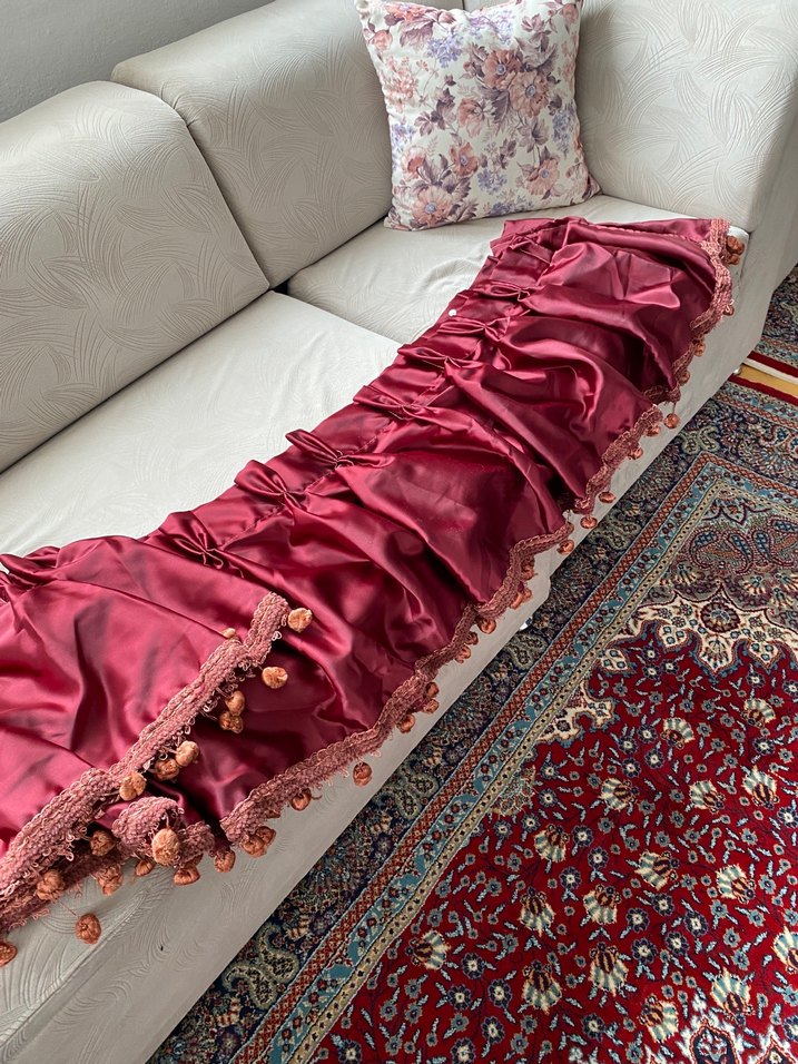 Bordo renkli, parlak kumaştan yapılmış, işlemeli ve püsküllü perde farması hiç kullanıpmadı perdeleri de mevcut