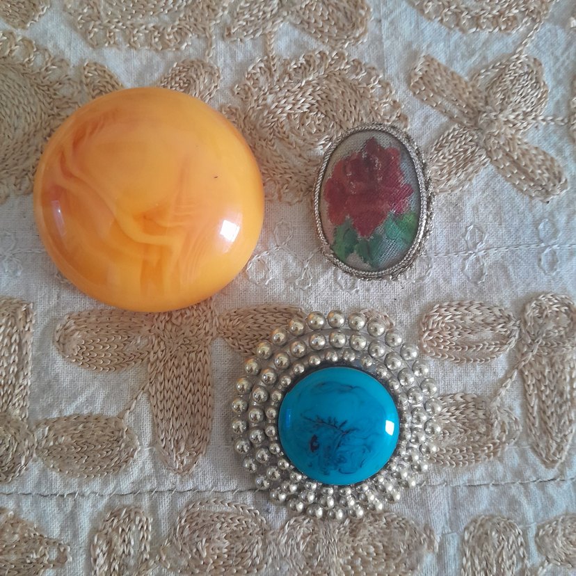 Eski dönem broşlar olup arka kısımları sağlamdır.Sarı renkte olanın arka kısmında hafif bombey vardır.