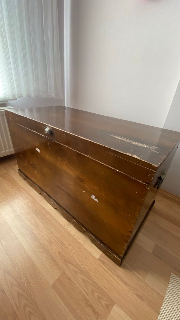 Antika ceviz çeyiz sandığı 40 yıllık içinde ufak bir deformesi var meşe macunu ile yapılabilir boy 95 en 45 iç derinlik 40 cm ankara içi elden teslim.