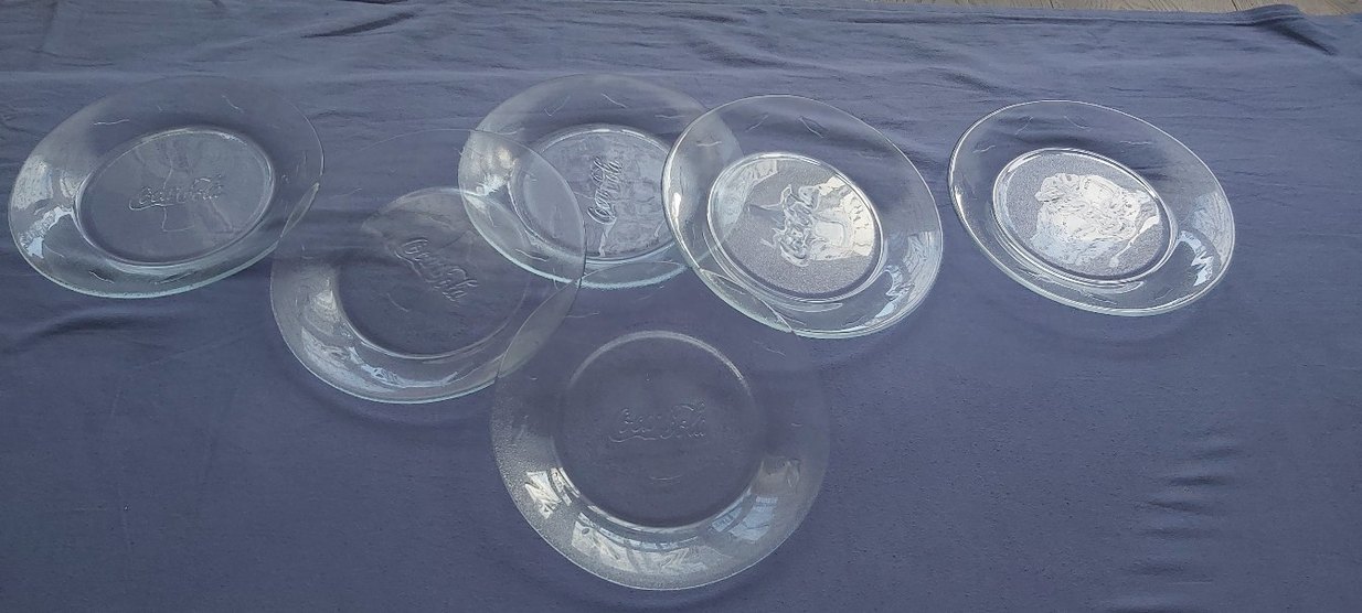 6 adet kullanılmamış/ çok az kullanılmış cam Coca Cola baskılı tabak. Çapı 23cm