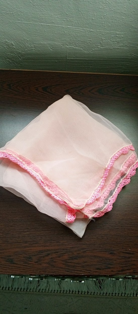 Pastel pembe renkte, ipeksi kumaştan yapılmış ve dantel kenar detayına sahip vintage tarzda kadın fularıdır. antika ürün