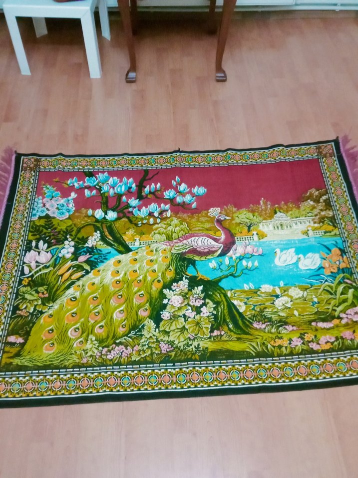 Renkli baskılı geleneksel halı, tavuskuşu ve çiçek desenleriyle dikkat çekiyor. Odaya canlılık katıyor. marka temsilidir