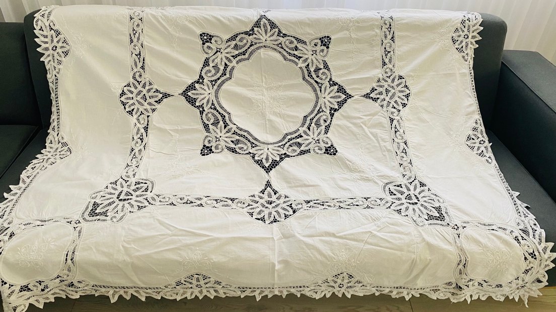 İşlemeli, beyaz renk detaylı beyaz masa örtüsü, geleneksel ve şık bir görünüm sağlar. Masanıza klasik bir dokunuş katar. Kondisyon olarak çok iyi durumda 160/160 .İade kabul etmiyorum