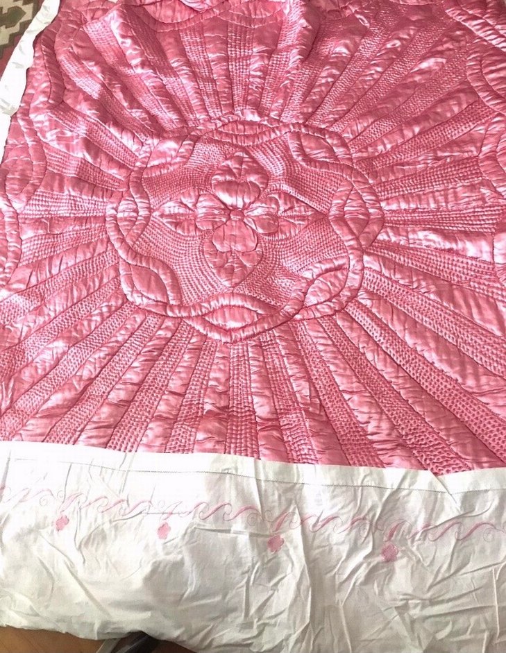 Parlak pembe kumaş üzerine işlenmiş detaylı çiçek desenleriyle dokulu bir yatak örtüsüdür. Yumuşak ve zarif bir görünüme sahiptir.