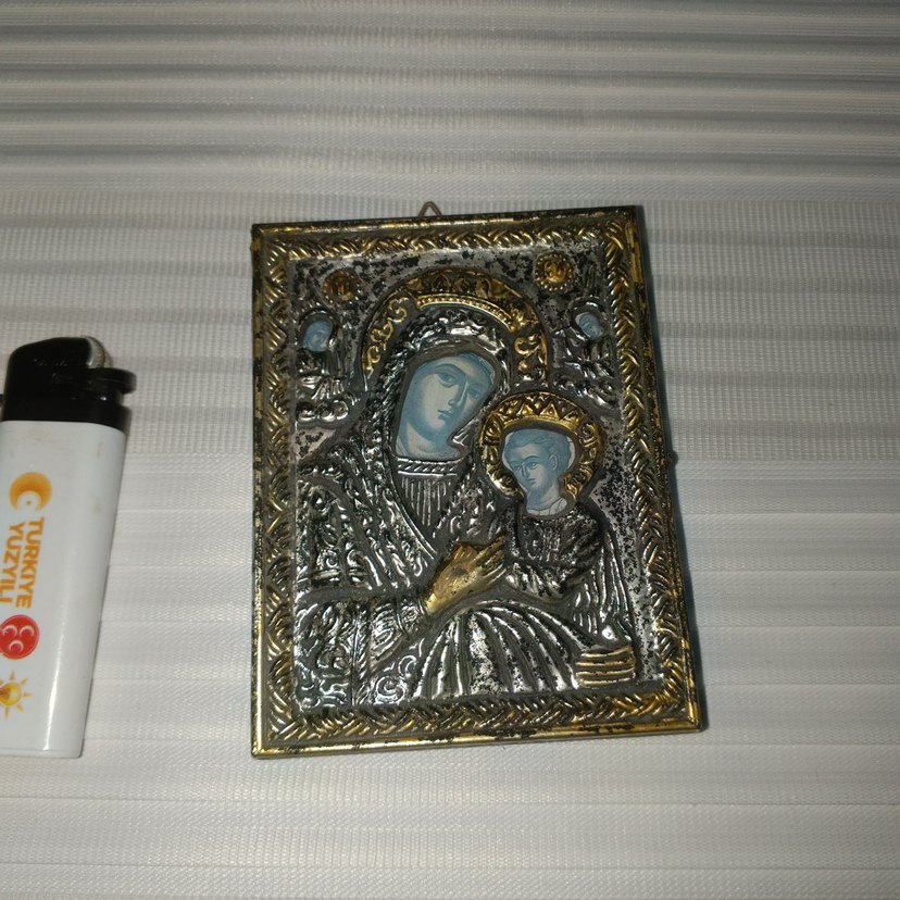 Altın ve gümüş tonlarında detaylı işlenmiş, duvara asılabilen bakır işlemeli Meryem ve İsa ikonasını gösterir. ✝️
