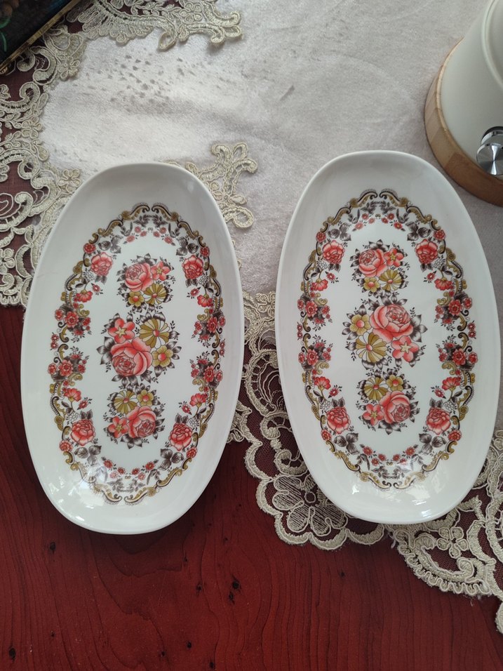 Pastel renklerde çiçek desenli beyaz tabaklar, ince gül ve süs motifleriyle süslenmiştir. Yemek servisi için uygundur.
