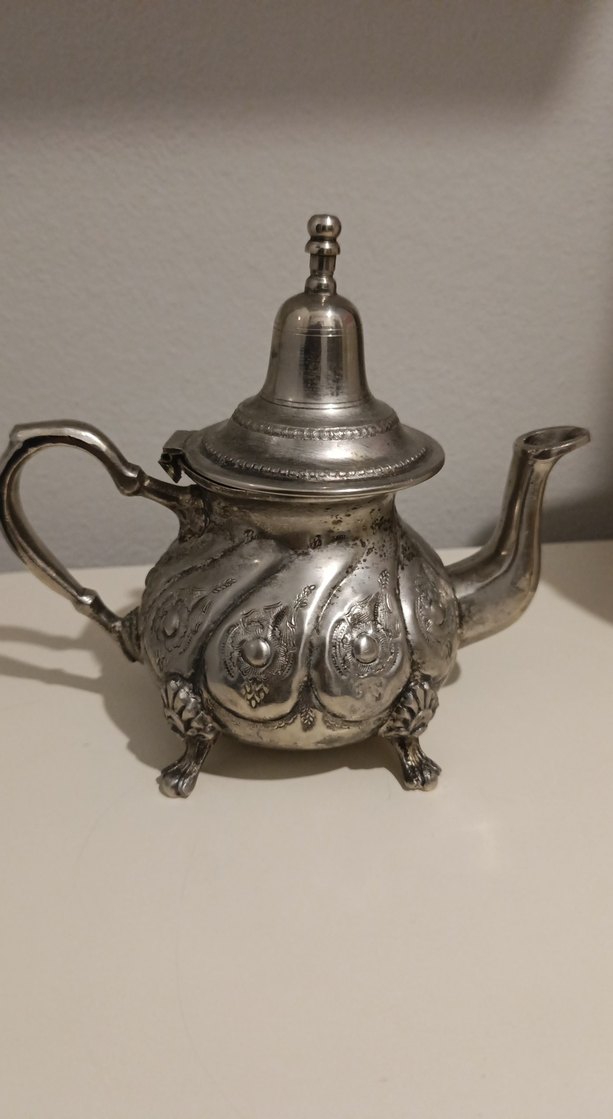 antika Fas Parlak beyaz renkte, işlemeli desenlere sahip gümüş çaydanlık. Kavisli ağız ve kulp ile dört ayak üzerinde durur.