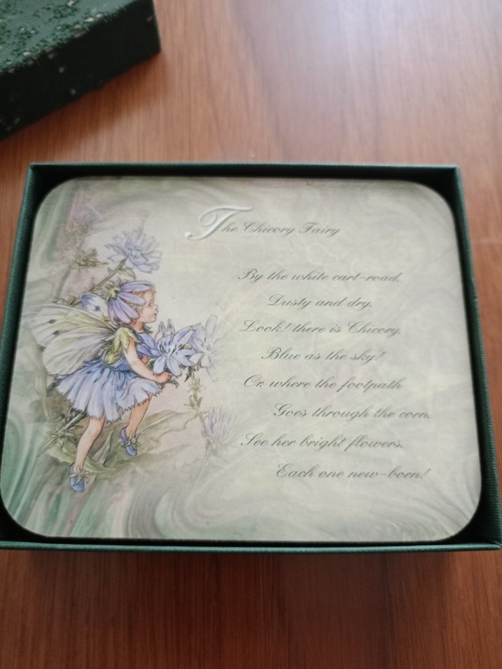 Fincan altlığı, pastel beyaz renkte, peri resmi ve şiir içeriyor. Yumuşak yüzeye sahip, üzerinde "Soes throu" yazısı görülüyor. ♀️