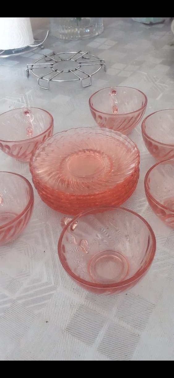 Arcoroc marka Fransız malı antika sayilabilir.pembe renkte, dokulu camdan yapılmış fincan set. Sunum veya dekorasyon için uygundur. ️