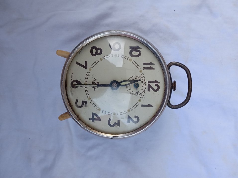 Vintaje Fransız yapımı...Çalışmasında sorun yok.Büyük siyah rakamlı bej ve gri metal masa saati, küçük ikinci kadranlı ve vintage tarzda klasik görünümde. ⏰ Flevron,Shanghai ve Peter Toplu 3 saat alımında iyi bir indirim yapacağım....