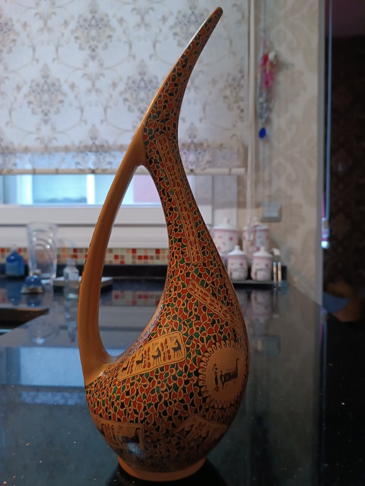 Deve renginde, renkli ve detaylı desenlere sahip, uzun ve şık formda dekoratif vazo.