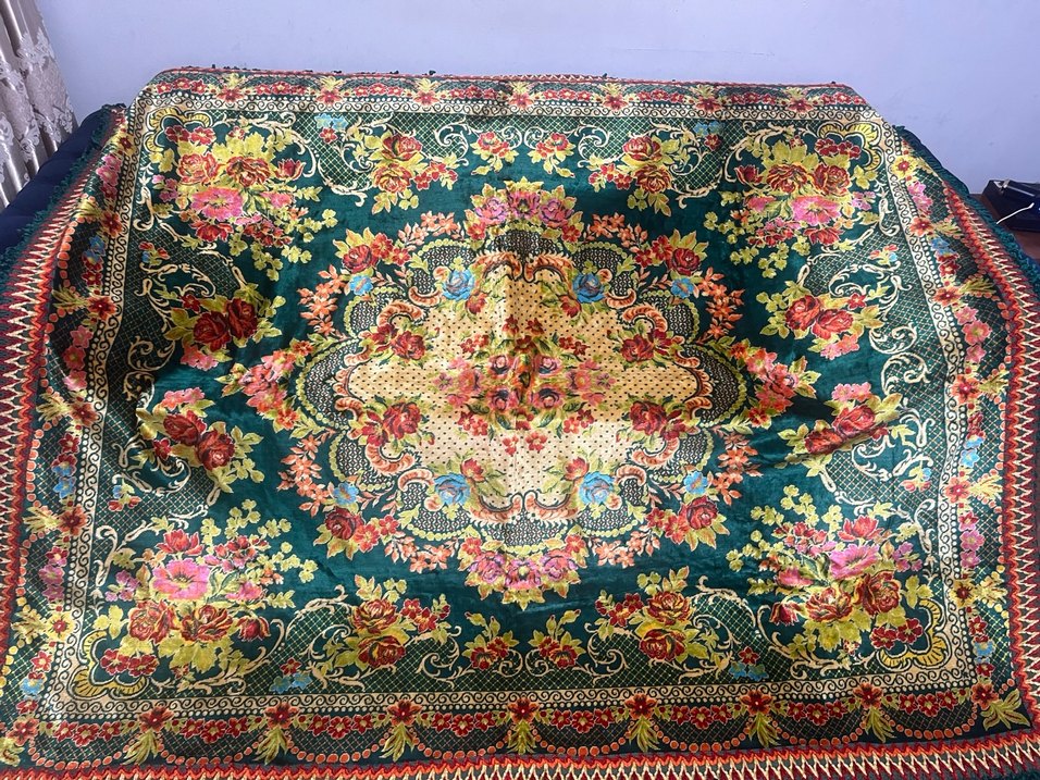 Canlı renkler ve çiçek desenleriyle bohem tarzda detaylı desenli renkli bir halıdır. Evde sıcaklık ve karakter katar. Antika ipek kadife örtü boy 224 sntm eni 189 sntm