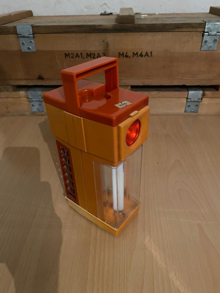 SİNEK KOVUCU ÖZELLİĞİ VE IŞILDAK BAKIM GEREKİYOR NADİR Bİ CİHAZ HER ZAMAN ÇIKMAZ Taşınabilir turuncu masa lambası, taşıma kulplu, kırmızı gösterge ışıklı, iç aydınlatması şeffaf panellerle görülür. Üzerinde M2A1.M2A2 ve M4.M4A1 yazıları bulunur.