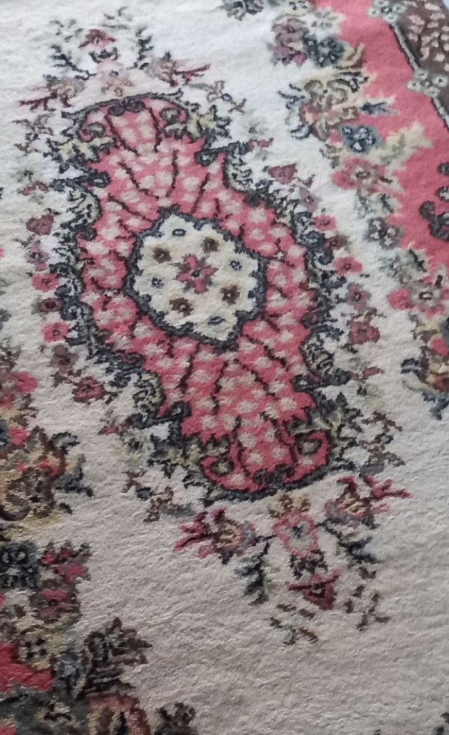 Pembe pastel tonlarında, geleneksel desenli klasik halı, mekana yumuşak ve şık bir dokunuş katıyor. 8 metre kare