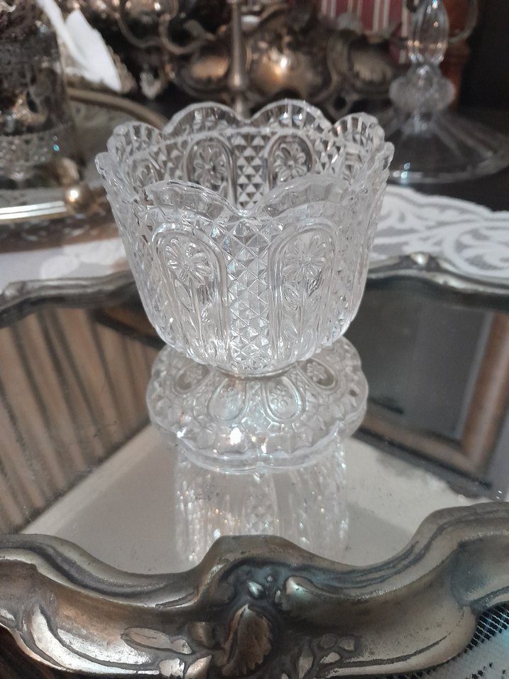 Yüzyılı aşan yaşı ile İnce işlemeli desenlere sahip beyaz cam vazo, dalgalı kenarı ve detaylı tabanıyla şık bir görünüm sunar.