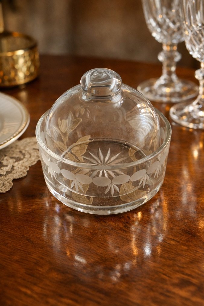 Şeffaf camdan yapılmış, parlak bej tonunda, zarif çiçek desenleri ve yuvarlak kapağı olan vazo. Masanıza şıklık katar. Antika kesme cam şekerlik , Paşabahçe ilk cam ürünlerinden 1950 ürünü