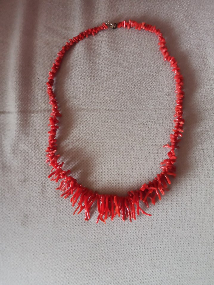 antika Kırmızı boncuklarla süslenmiş, bohem tarzında renkli bir kolye. Midi uzunlukta ve desensiz, günlük kullanım için uygundur. bana tunus'tan 1980 yılında hediye geldi antikadır orijinal mercandır bilginiz olsun