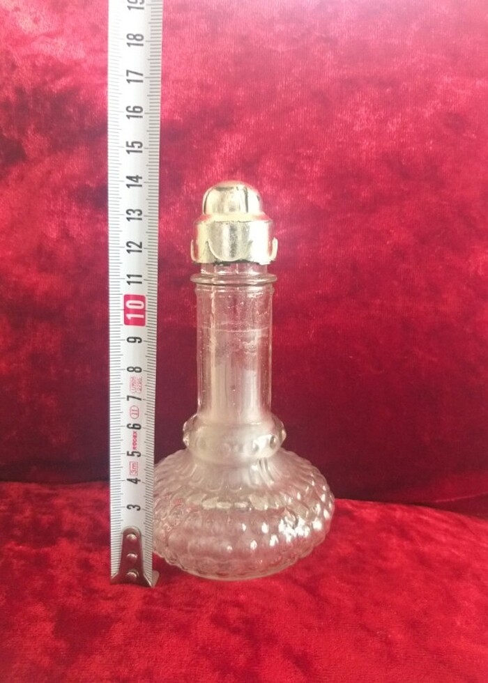 Eskilerden kalma dökme kalın cam kolonya şişesi, esans şişesi olabilir. Ölçüleri fotoğraflarda var.