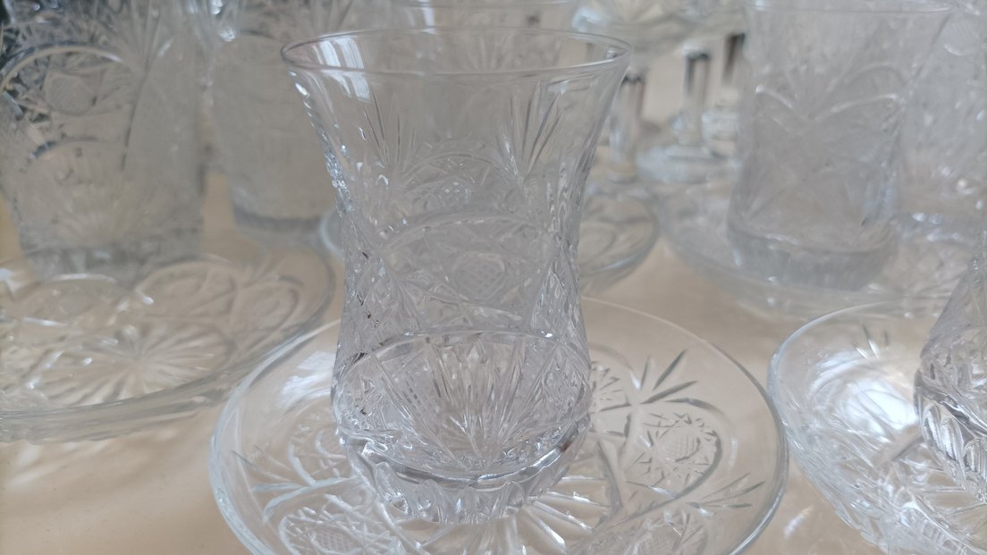 1 sürahi 250 lira, diğerleri parça 100 lira 6 su bardağı 6 kadeh kadehin bir tanesinin ayağı yarım kırık, 6 meyve suyu bardağı 5 çay bardağı,6 çay bardağı tabağı 30 parça,hiç kullanılmadı çay bardağı taşınırken kırıldı kesme antika kristal sürahi takımı