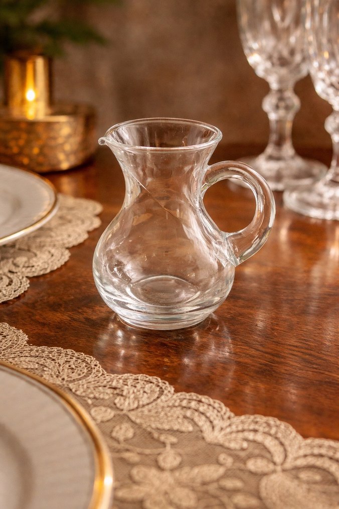 Parlak bej renkte, kulplu ve dökme ağızlı cam sürahi. İçecek servisinde kullanılır. Antika cam küçük boy karaf , Paşabahçe ilk cam ürünlerinden 1950 ürünü