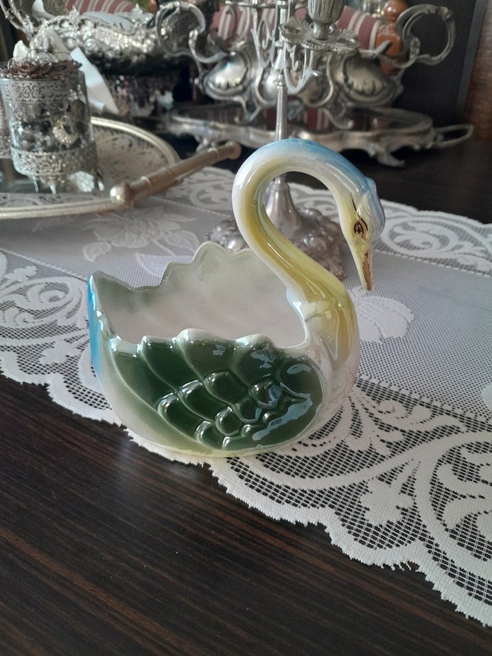 Antik yurtdışı porselen Pastel tonlarda beyaz ve yeşil renkli, içi boş porselen kuğu figürü. Küçük eşyalar için kullanılabilir.