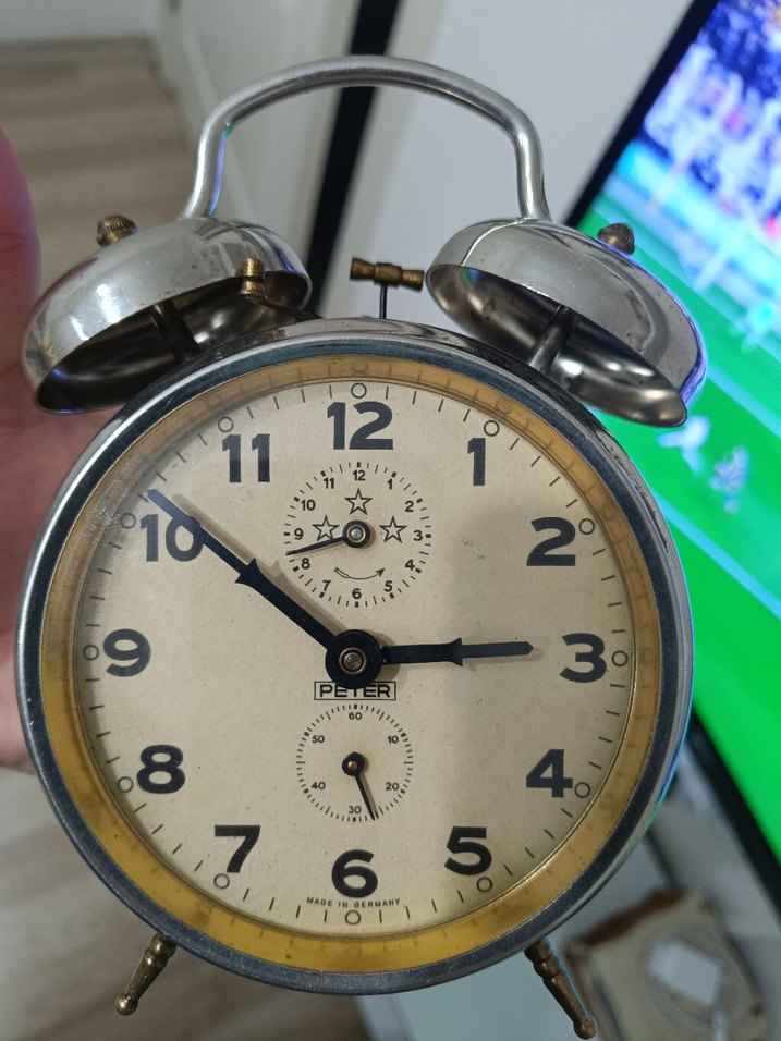 Bej ve beyaz metal gövdeli, klasik tarzda çalar saat. Üstte çift zil ve net siyah rakamlar bulunur. Küçük ek kadranlar saniye ve alarm ayarı için mevcuttur. ⏰