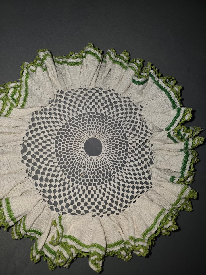 Antka marollu dantel Merkezde tığ işi desen ve yeşil detaylı fırfırlı kenarları olan el yapımı dekoratif dantel. Masa süsü olarak kullanılabilir.