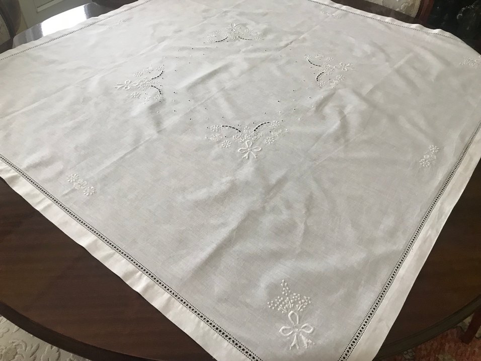 Nakışlı çiçek desenleri ve klasik tasarıma sahip beyaz masa örtüsü, hafif gri detaylarla süslenmiştir.