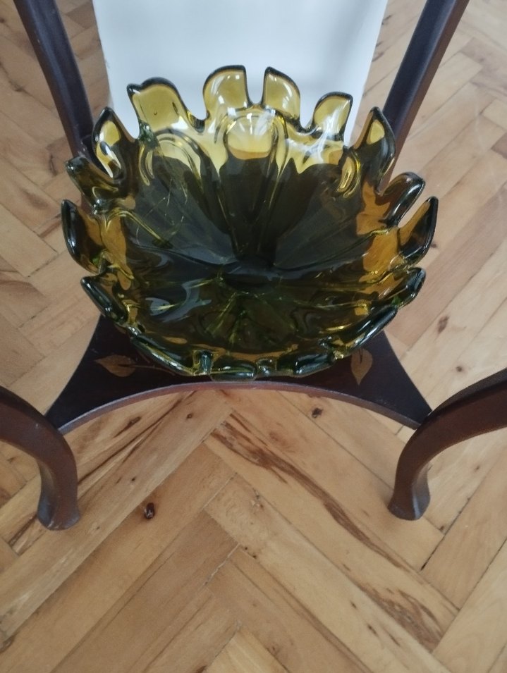 Koyu haki renkte, camdan yapılmış ve dalgalı tasarıma sahip dekoratif vazo. Mekâna sanatsal bir dokunuş katar.