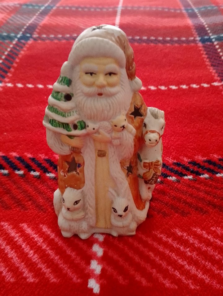 en az 50 senedir bizde Küçük hayvanlarla çevrili, elinde yılbaşı ağacı tutan beyaz Noel Baba figürü.