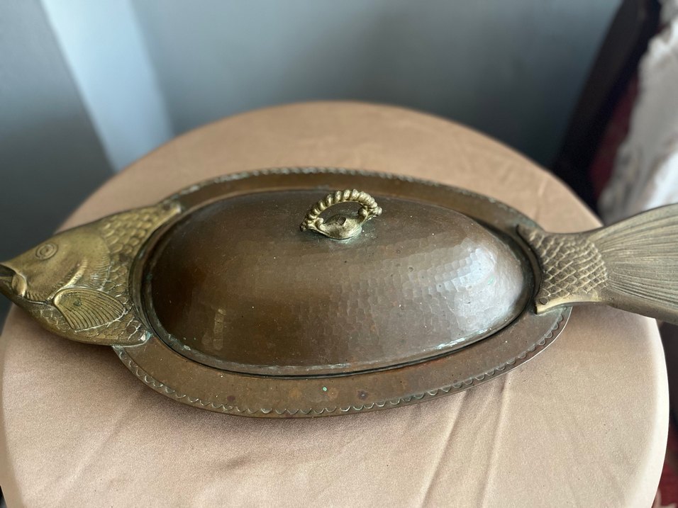 Antika Parlak döküm bakırdan yapılmış, burgu saplı kapak ve süslü kenarlı tabanlı yemek ısıtıcısıdır.