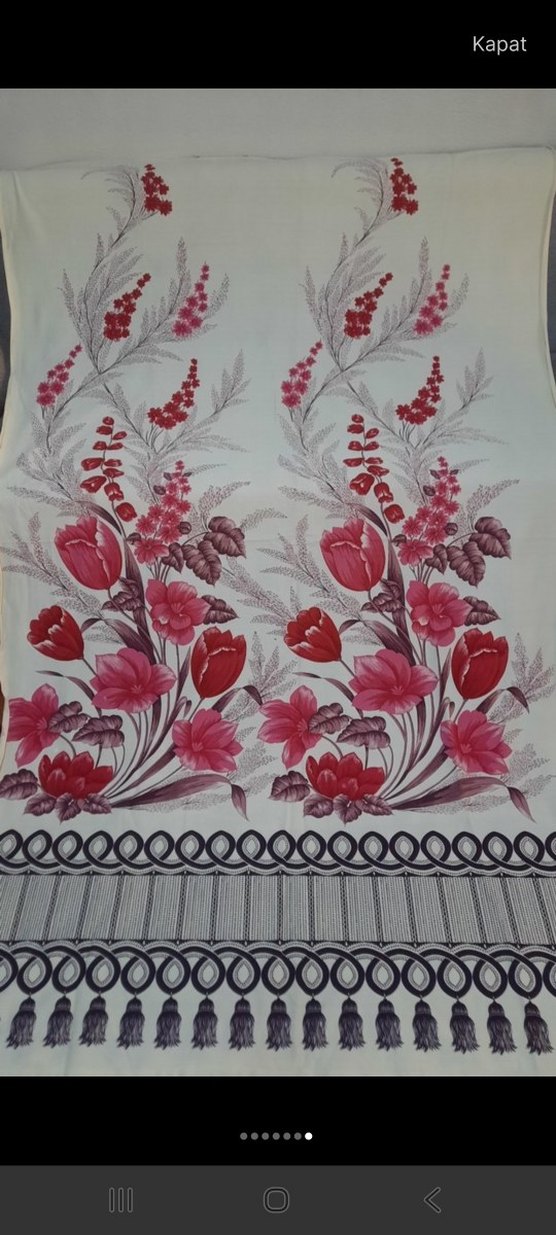 Bordo tonlarında çiçek desenli baskıya sahip, klasik tarzda bir perde. Alt kısmında dekoratif bir bordür bulunur. hiç kullanılmadı 4 adet perde yenidir
