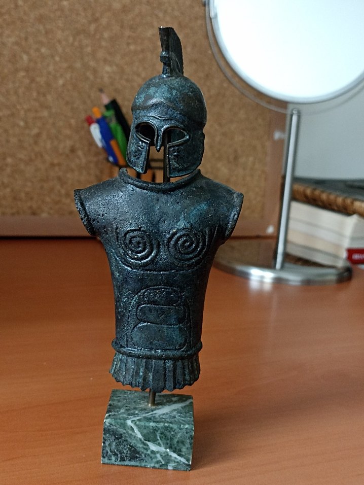 Pirinç Turkuaz renkli koyu antik savaşçı biblosu, detaylı zırh ve miğferle mermer kaidede duruyor. ️