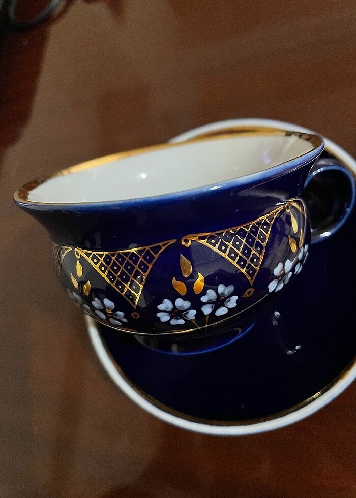 Antika el boyaması mine işçiliği Rus damga kobalt porselen kıymetli bi fincan. Duble kahve ve çaya uygundur. Altın vermiyeleri çok güzel, kabartmaları ele geliyor.