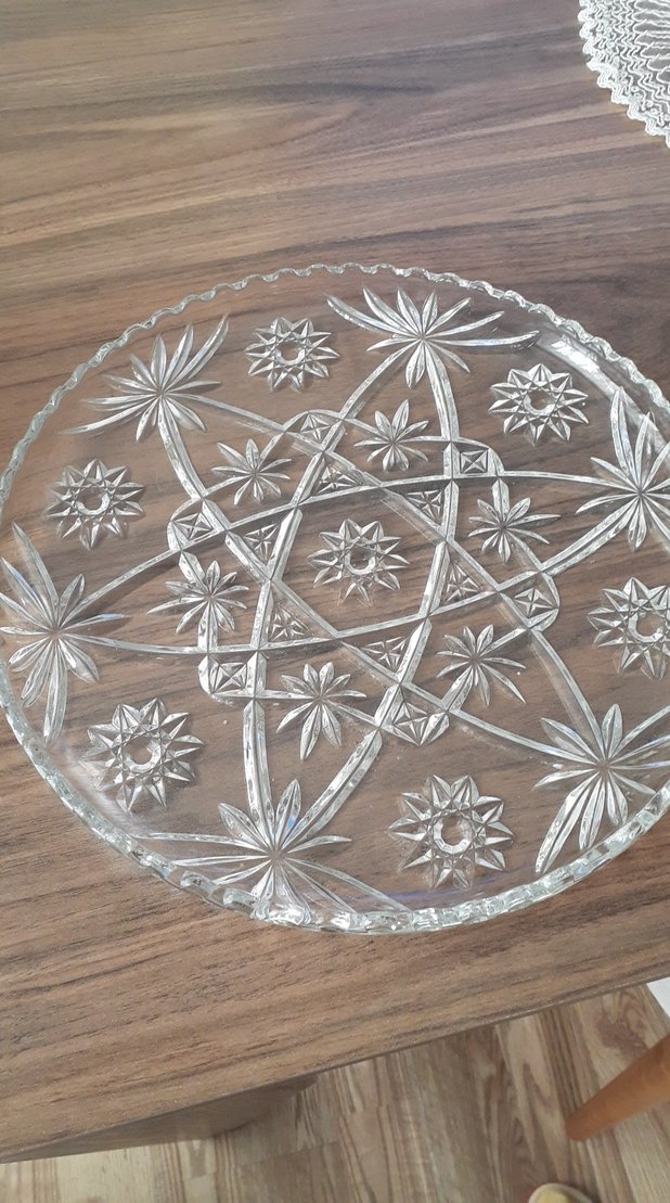 Şeffaf renkte, vintage tarzda, çiçek desenli ve parlak yüzeye sahip en az 40 yıllık şık çok iyi durumda sunum,meyva tabağı