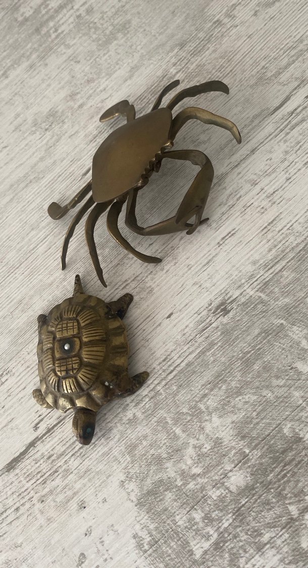 Koyu altın renginde, detaylı işçilikle yapılmış yengeç ve kaplumbağa figürleri.