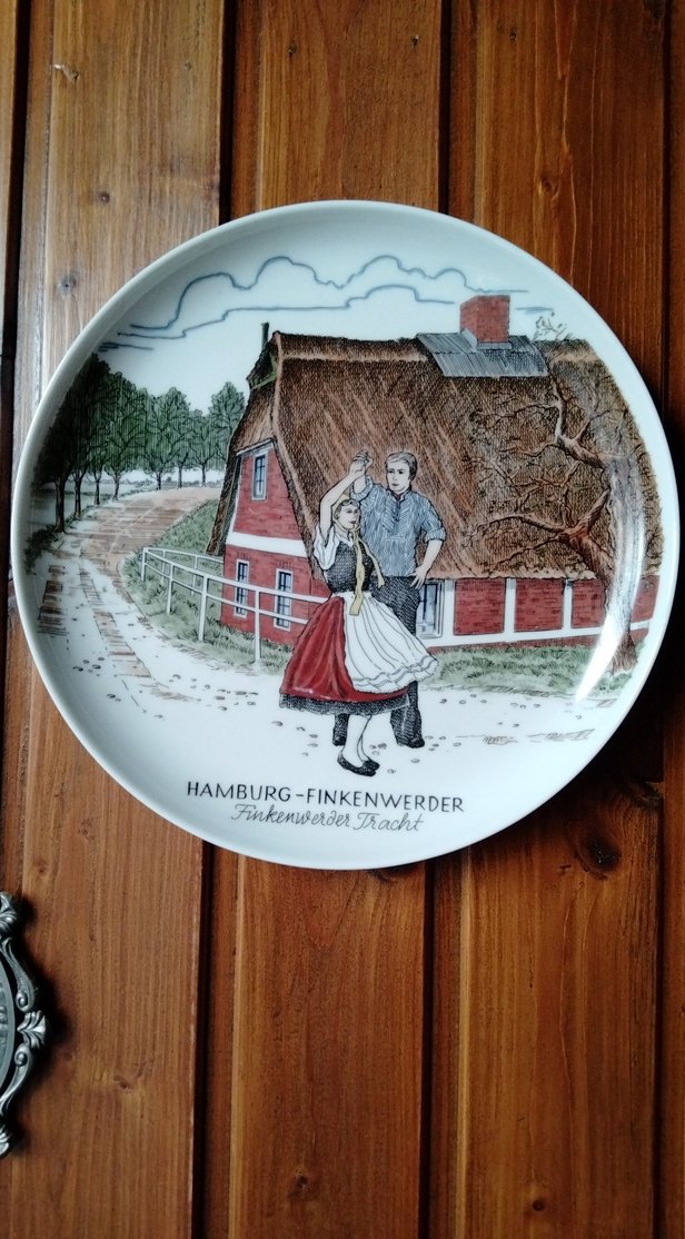 Hamburg-Finkenwerder'den bordo renkli, geleneksel sahneyi gösteren dekoratif tabak. Ev dekorasyonu için uygun. ️Gerg 1849