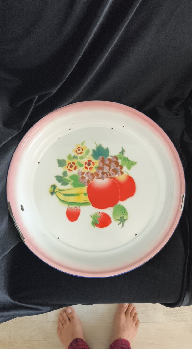 Hafif renkte, pembe kenarlı, çiçek desenli ve meyve figürlü çok renkli geleneksel tarz tepsi. 45 cm.