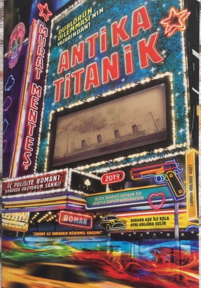 Koyu mavi renkte, 'Antika Titanik' başlıklı ve eski bir gemi resmi ile renkli neon tarzı yazılar içeren kitap kapağı. 2019 tarihli polisiye roman Murat Menteş'e ait.