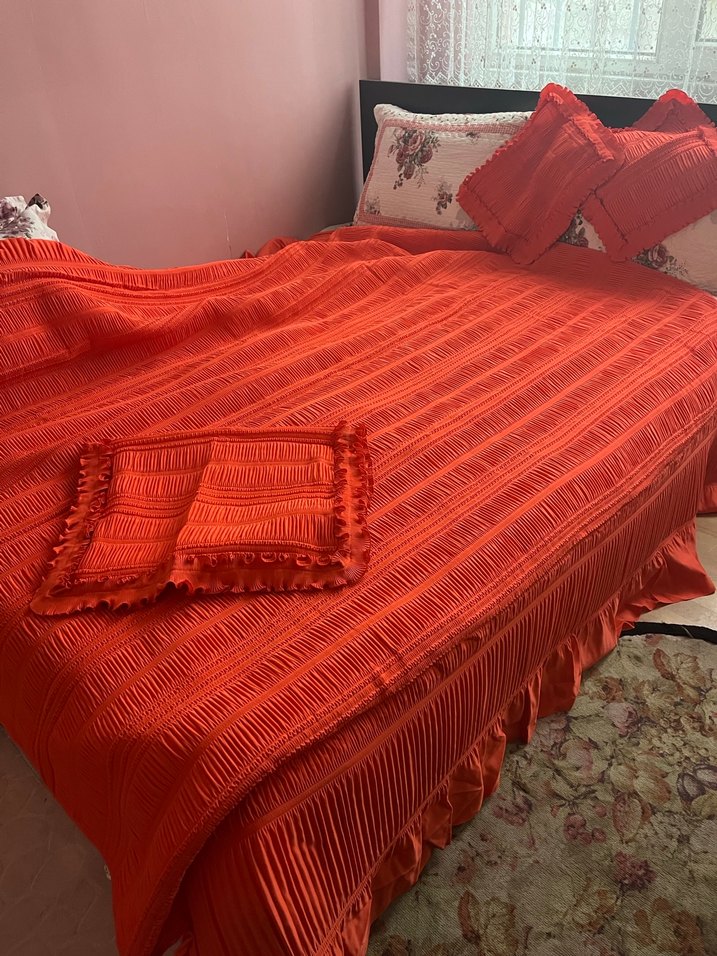 Nakışlı desenlere sahip canlı kırmızı renkli yatak örtüsü, yatak odanıza doku ve sıcaklık katar. Uyumlu dekoratif yastıklar dahildir. ️