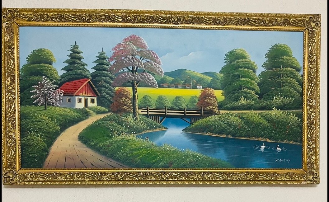 Koleksiyonluk Yağlı Boya Ahşap Çerçeveli Ressam:H.Alakoç imzalı Ölçüsü:110cm 60cm Bu tablo, nehir, köprü, ağaçlar ve tepelerden oluşan pastel renkli bir manzarayı gösterir, süslü altın bir çerçeve içinde.