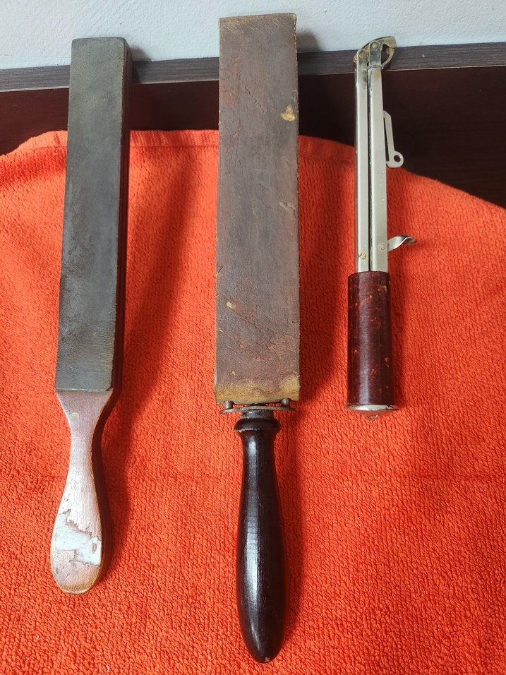 ahşap tutacaklı koyu renk 2 adet ustura deri kayış, 1 adet alman çakmak