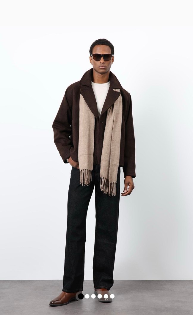 Kahverengi süet erkek ceket, notch yaka ve uzun kolludur. Normal boyda, desen içermeyen tasarımı günlük kullanıma uygun şık bir görünüm sunar.