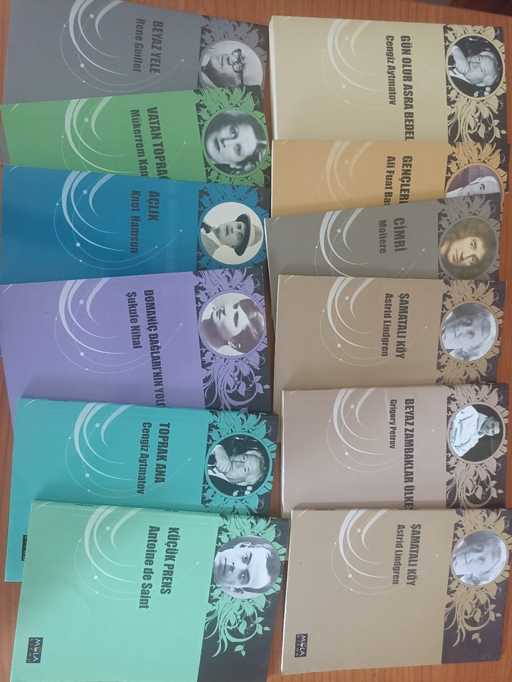 Antoine de Saint-Exupéry'nin Küçük Prens ve diğer eserlerini içeren kitap seti, klasik kapaklar ve yazar portreleriyle.