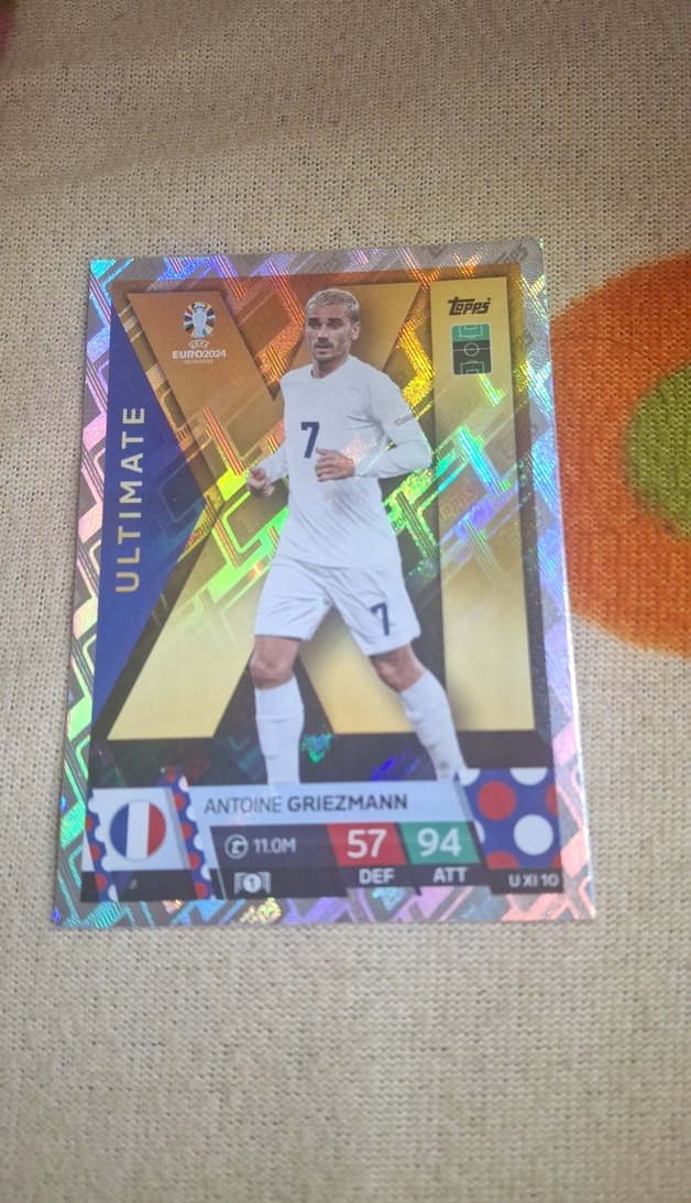Antoine Griezmann'ın savunma ve hücum istatistikleriyle altın renkli erkek rozeti, pop kültür ve athleisure tarzında. ⚽