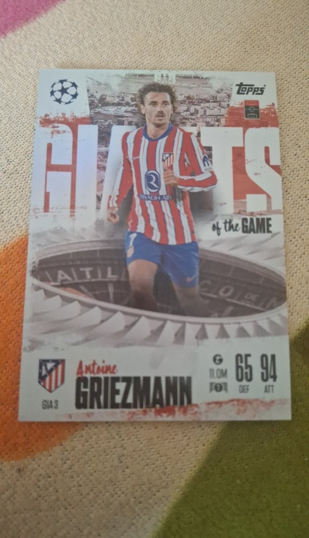 Antoine Griezmann'ın istatistikleri ve takım logosu bulunan parlak gri futbol kartı. Üzerinde "65, 94, ATT, theBAME, Anteine" yazıları yer alır. ⚽