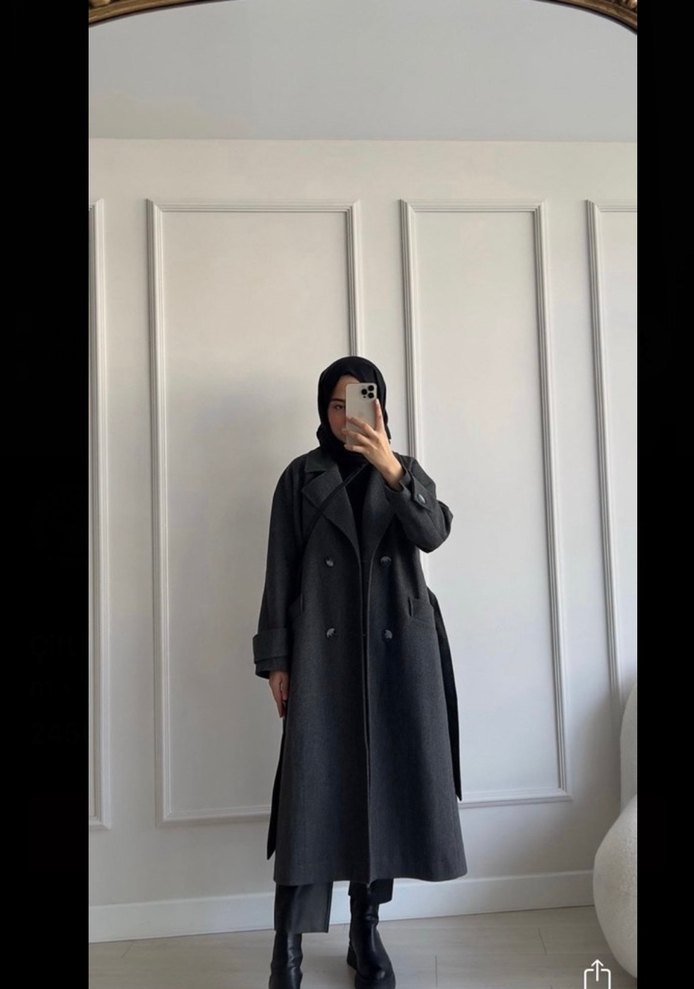 Gri uzun kaban, notched yaka ve uzun kolludur. Yumuşak ve sıcak kumaştan yapılmış, sade ve şık görünüm sunar. Günlük kullanım için uygundur.
